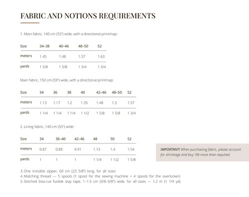 IMPORTANT! When purchasing fabric, please account for shrinkage and buy 5% more than required.
