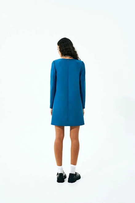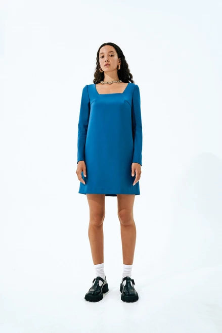 Becky is a semi-fitted trapeze dress finished with a free-hanging lining. The dress features a deep square neckline and fastens with an invisible zipper in the center back seam. The front is fitted with bust darts transferred to the side seams while the back features shoulder darts transferred to the neckline. The long set-in sleeves are made up of two pieces. Becky is above-knee length.
