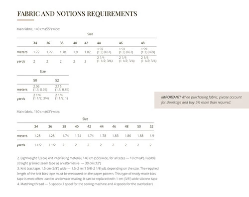 2. Lightweight fusible knit interfacing material, 140cm (55”) wide, for all sizes and heights – 10cm (4”). Fusible straight grained seam tape as an alternative – 30cm (12”).