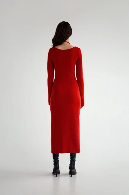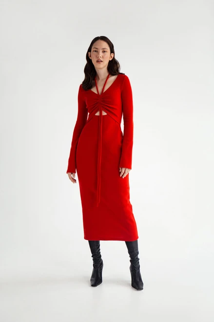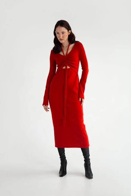Leora is a close-fitting dress with a sheath silhouette. The front is made up of two separate parts, the front bodice and the front skirt. The center front bodice seam is finished with two channels. The tie pulled through the channels shapes a bust gathering. The top edge of the front skirt is curved. The dress features long set-in fitted sleeves and a deep V-neckline. Leora is below-the-knee length.