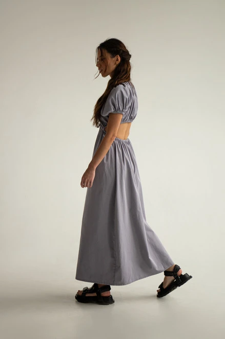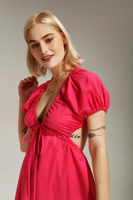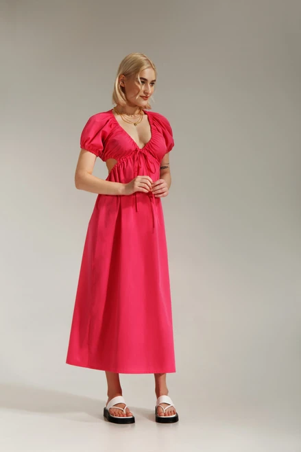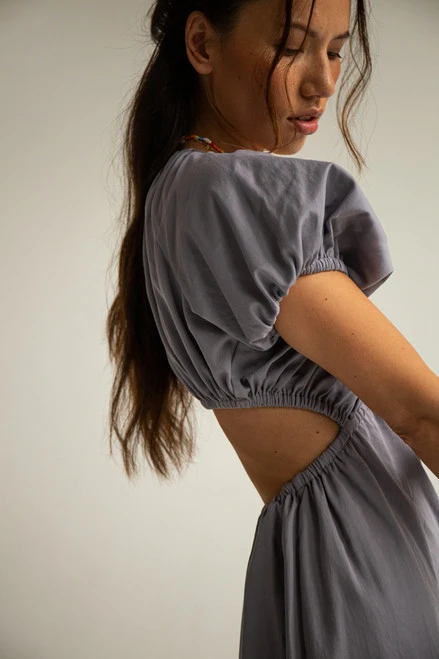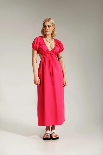 Oona is a semi-fitted A-line dress. The front bodice is only partially attached to the skirt, creating cutout sides, with the skirt sitting above the natural waistline. The dress has a wide, deep V-neckline that features gathers and elastic threaded through channels. The back bodice is cropped and the lower edge of the front and back bodice has elasticated channels. The back skirt is not attached to the back bodice and has a gently curved waistline. The upper edge of the front and back skirt has ties attached to an elastic threaded through channels. The voluminous raglan sleeves have an elasticated hem. Oona is above ankle length.