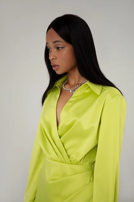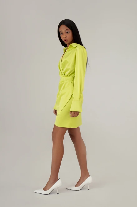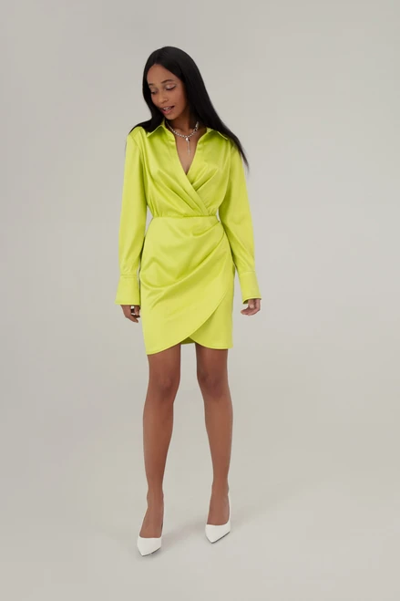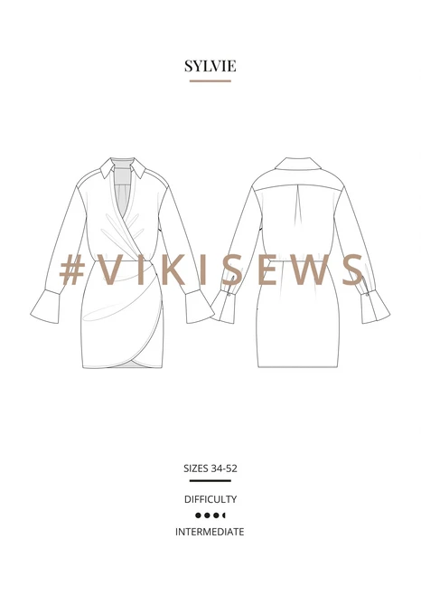 Sylvie is a semi-fitted dress with a fitted waist. The dress features a waistline seam, faux wrap front and waist pleats. There is a double layer yoke at the back with the shoulder seam shifted toward the front. The bodice is gathered at the front and back waist. The front skirt consists of two overlapping parts and features pleats in the left-hand side seam. The dress has a foldover collar with a collar stand, a deep V-neckline, and a slightly extended shoulder line. The set-in sleeves are long and semi-fitted. The bottom of the sleeve features pleats and a bias-bound slit. The sleeves are finished with cuffs with a button and loop closure. The dress closes with an invisible zipper in the left-hand side seam. The dress is above-knee length.