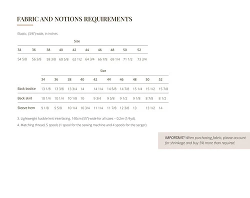 Important! When purchasing fabric, please account for shrinkage and buy 5% more than required.Â