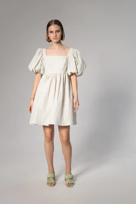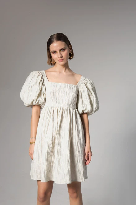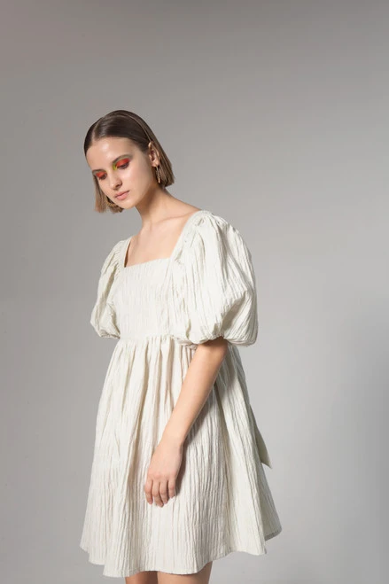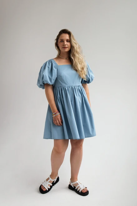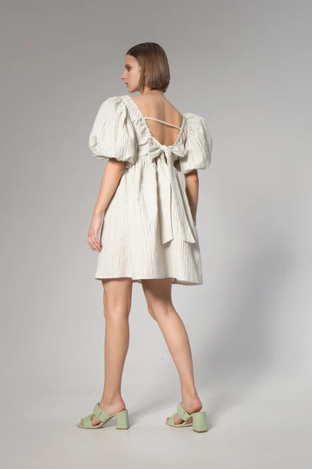 Uni features a semi fitted bodice, an empire waist and a voluminous skirt with gathers. The shaping of the bodice is achieved with bust and waist darts. The front bodice has a wide, square neck, while the back bodice has a U-shaped neckline ending at the waistline. The neckline edge on the back bodice is gathered using elastic threaded through applied channels. The back strap sewn into the channels at the shoulder blades level secures the back bodice in place. The back bodice features wide ties that form a bow with long tails at the bust level. The shoulder seams have been shortened. The voluminous sleeves are set-in and feature tight gathers around the cap. The hem of the sleeve is elasticated. The sleeve is above-elbow length. The skirt is straight, wide and features tight gathers at the waistline. Uni is above-knee length.