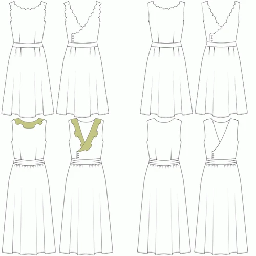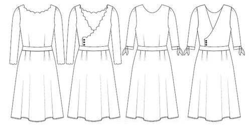 This cocktail dress features 3 different neckline options (scalloped, straight or flounced), 2 waistband options (straight or pleated) and 2 skirt options (pleated or gathered). It can be made in an above the knee length or above the ankle length. The back of the dress has a crossover that ends with a false buttoned opening. The close-fitting bodice is lined. The pattern also includes a bonus option to add 3 lengths of sleeve with 3 different cuffs (flat, scalloped or tied).