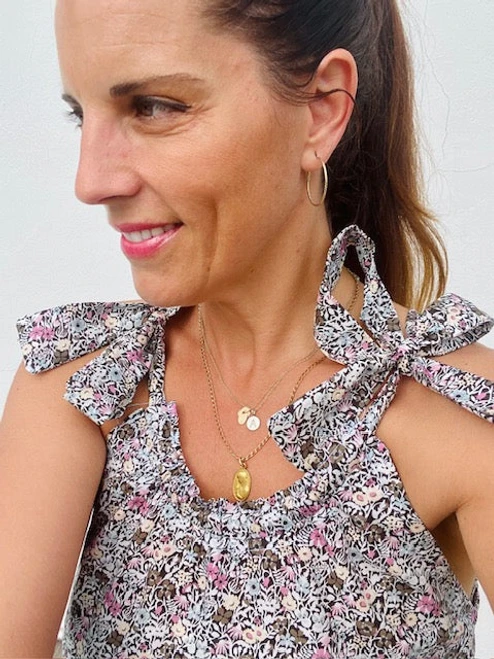 This sweet little top and dress pattern is super easy to make, as well as to wear.ย There are two strap options: a classic narrow and straight version, and another tied in bows for a more romantic touch. The armholes are finished with facings.
